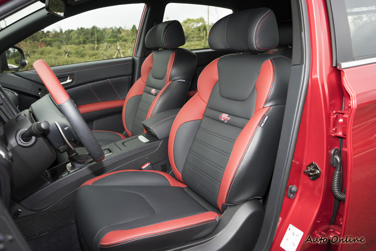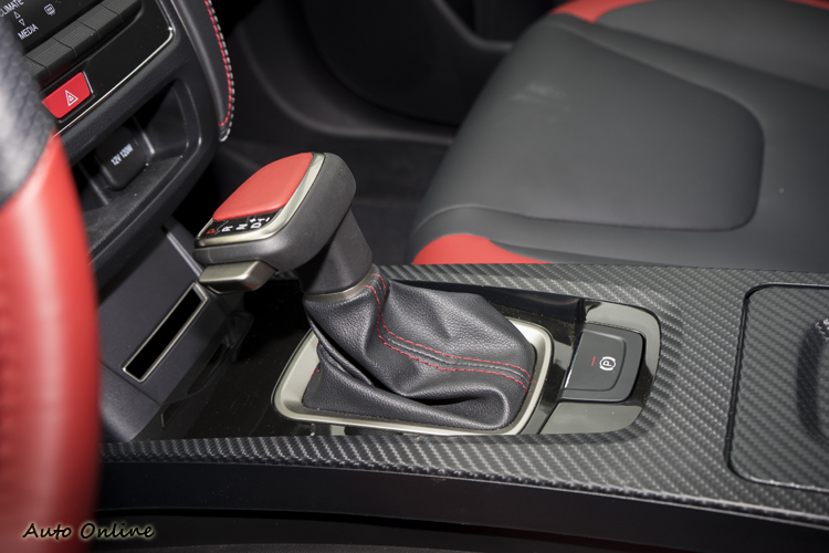 例如頭燈邊框暗色處理、廠徽兩側與水箱罩的黑色飾條,以及黑色碳纖維紋路的專屬空力套件等,後視鏡外殼也以消光黑來處理,與試駕車的紅色車身搭配也營造出一些視覺上的對比與個性感。