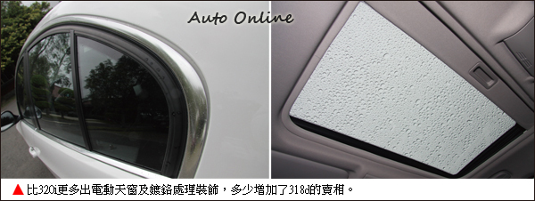 安全配備方面,基本上是和320i幾乎相同:標準六氣囊、主動安全頭枕與DSC、DTC系統一應俱全,也有遠近燈HID頭燈和日行燈,除此之外,分離式恆溫空調系統、引擎啟動/停止鈕,還有車輛機能鑰匙記憶功能都是標準配備,而它比320i多了車門鍍鉻裝飾與電動玻璃天窗等配備。比較不足的部分,是前座椅標配只有半電動調整,也就是高度與椅背角度為電動調整,前後是手動調整。另外,中央控制台也沒有配置大型液晶螢幕,因此想要播放DVD、使用i-Drive系統、原廠衛星導航系統,這些都必須另外加購。整體而言,318d除了把定速巡航系統和車內防眩後視鏡列為選配,讓人覺得有點可惜,基本上原裝配備還算完整,不算陽春,相信以這款入門車而言,一般人都是可以接受的。