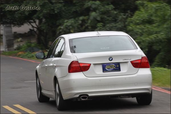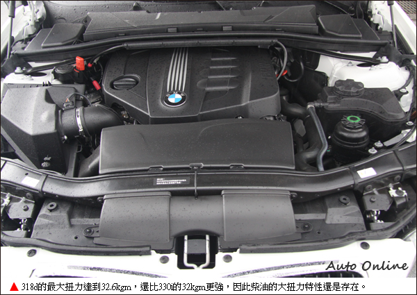 在柴油車上,143hp的馬力一點也不嫌小,況且318d的最大扭力甚至還比330i還要大,並且適用範圍更廣,也就是平常輕鬆駕車的場合中就用得到。引擎運轉聲也一如BMW其他三代共軌的四缸柴油引擎一樣,車外還是聽得到明顯的特殊機械運作聲,但進入車內關上車窗後,噪音就相當輕微了,BMW在隔音工程上還是很不錯的。
