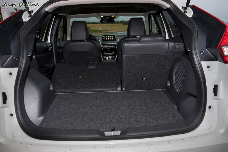 ▲標準狀態下行李廂空間為374公升,後座椅背方倒後的地板也很平坦。