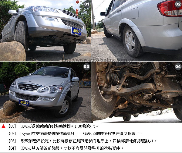 Kyron的強項優勢也是在動力上,源自於M-Benz的柴油動力引擎,其低轉速大扭力的引擎特性,最為適合越野地形上的使用,轉速不必拉高只需要控制在最大扭力輸出的轉速域附近即可,保持了最大扭力的抓地力,又不會因為拉高轉速產生過大馬力,導致空轉打滑的事情發生,保持轉速即可像是擁有了源源不絕動力一樣。雖然Kyron仍使用最常見的Part Time 4WD系統,牢靠不易發生故障,未嘗不是好事呢?