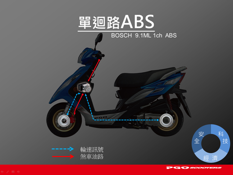 最後看到這次改款的重點ABS防鎖死煞車系統,如同引言所提及的,PGO BON 125 ABS採用的是BOSCH 9.1ML單迴路ABS系統,之所以採用單迴路系統,主因在於BON使用的是前碟煞後鼓煞的配置,由於鼓式煞車使用的是線傳控制,這樣的設計與使用油壓控制的ABS系統並不相容,因此只能裝載於使用油壓控制的碟式煞車上。