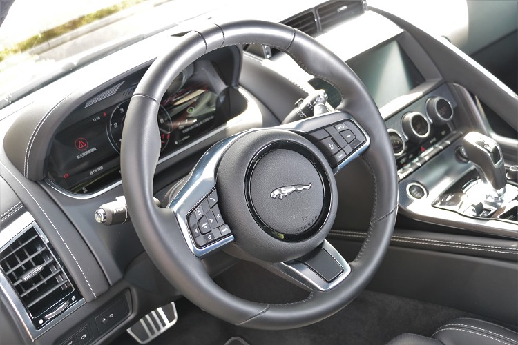 進到車內,駕駛者前方的12.3吋高解析度儀表板和中控台上標配10吋智慧觸控顯示幕,建構起F-Type的科技感。儀錶板可切換不同模式顯示,像是有傳統雙圓、單圓或者全地圖等。中控台智慧觸控顯示幕,支援Apple CarPlay娛樂系統,讓原廠的中文化衛星導航無用武之地。車頂全景天窗無法開啟,主要以採光功能為主,天窗前方則有原廠緊急救援,特殊情況下能得到原廠的幫助。
