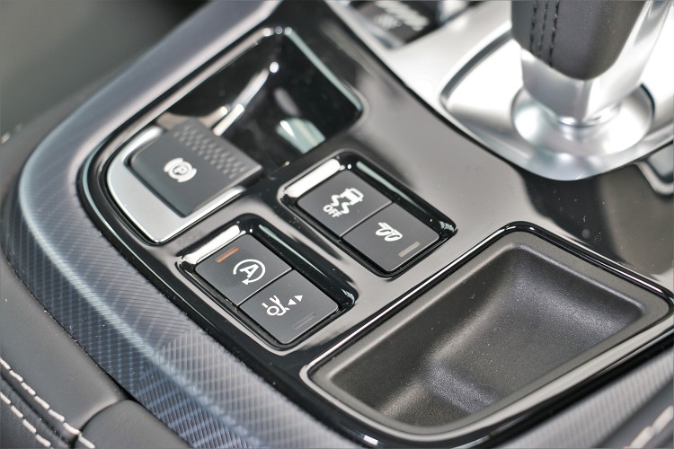 回到外觀部分,P450 R-Dynamic與P300 R-Dynamic造型相似,水平延伸的頭燈組,大面積的水箱進氣壩,搭配上引擎蓋開孔設計,可幫助引擎有更好散熱。車側前後外擴式輪弧,搭配隱藏式門把手讓車側更加簡潔有力,拳拳到位有著跑車氣勢。車尾的調整幅度不大,後保桿微微更動,尾燈的細節與內部光源突顯細緻, P450尾管採左右雙出,大排量V8引擎所帶來的聲浪相當渾厚,原廠標配主動式跑車排氣系統,透過按鍵控制能得到高亢的聽覺饗宴。試駕車型選配黑色外觀套件,水箱護罩、車側葉子板通風孔、窗框飾條、車尾品牌字樣等,都採用亮黑色處理。