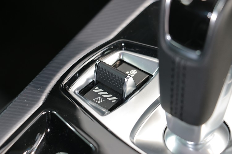 ▲排檔桿後方的控制介面能調整排氣聲浪、尾翼作動與循跡。