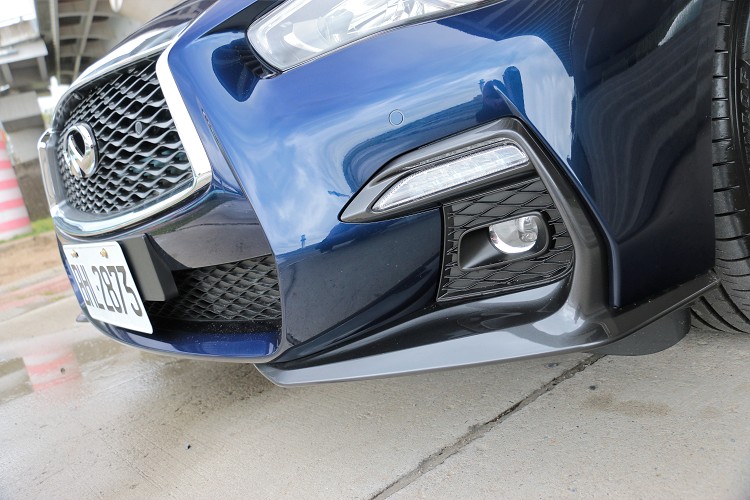 試駕車款為Q50 Silver Sport車型,有專屬的外觀空力套件,並換裝運動化前後保桿,車頭更低寬且延伸的前進氣壩,兩側搭配賽道元素的鈦銀色F1方程式定風翼,展現更強烈的視覺張力。車側維持品牌一貫作風,像是新月型C柱、湧浪式車身設計等,對於四門轎跑車有加分效果。來到車尾,後保桿下方有Diffuser快速排出車底亂流,並施以與車身同色,左右單出排氣管,扎實傳遞V6引擎排氣聲浪,散發出濃濃的跑格味道。