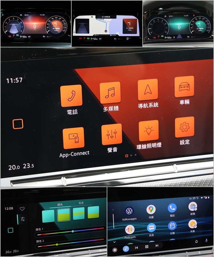 八代Golf不僅高階車型配備Digital Cockpit Pro 10.25吋全邏輯數位化儀錶,就連最入門的230 eTSI Comfort也看得到它!這套儀錶同樣提供仿類比圓盤和全螢幕的顯示模式,配色可隨著不同駕駛模式或指定的氣氛燈轉換,並且能自行設定所需顯示的畫面,而它的高解析螢幕也有助於理解駕駛輔助功能,無論是汽車的細節或標線的描繪都十分清晰。值得一提的是,這款車的全彩抬頭顯示器採用的是投射在玻璃,而不是像Arteon那樣的透明面板,除了質感更好,所提供的資訊、圖示都很豐富,而且字體大小及配色也恰到好處。