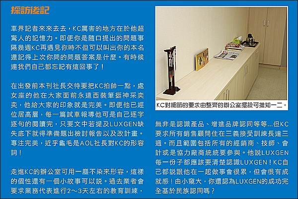 KC:當有一天世界聽到LUXGEN就想起科技智慧車、連結起台灣。如果做到了,我就覺得這們多年在車界的努力就都值得了!