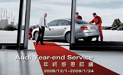 而最受車主關注的Audi每月限時限量特惠活動更是精采可期,以三折起的驚人優惠讓車主輕鬆為愛車再添新裝。其中,12月份的Audi限時限量特惠活動,推出Audi A4(B6/B7)影音多媒體系統,凡於12/10~12/25回廠安裝者,還可獲得知名腳踏車DAHON D7自行車一部。而迎接新的年度,1月份則推出各車型運動套件優惠,僅12,500起(不含烤漆及安裝工資)即可成就動感新體驗。各車型全車防護墊(車內地墊+行李箱防污墊)以單一特價$3,900三折左右優惠。活動期間內回廠即可獲贈鼠墊記事本乙份。消費滿$10,000,再送Audi皮件MEMO夾乙份。活動詳情請洽全省維修據點查詢。