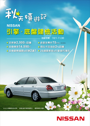 ![]() NISSAN「秋天嬉遊記」活動,除了上述原廠檢查服務及優惠之外,凡於活動期間刷NISSAN感心服務卡,另享週一、週三洗車打蠟9折、2S鏡面美容85折,及中油直營加油站刷卡金額2%回饋。相關活動詳情,請洽NISSAN服務專線 0800-088888或NISSAN企業網站www.nissan.com.tw。