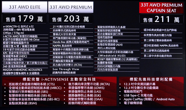 動力應用e-SKYACTIV-G 3.3L 直列六缸渦輪增壓引擎搭配 48V 輕油電技術,搭配八速手自排變速系統,可輸出345ps/51kg-m最大馬力,也是該級距唯一馬力超過300ps的車款,每公升平均油耗達到 12.2 公里更是名列級距前茅。