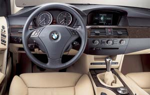 ▲長、寬、高為4841、1469、1846mm,車系軸距增加到2888mm。安全配備方面,BMW在E60追加了ACC主動式巡航控制裝置,和可變照明角度頭燈。ACC可強迫限制車輛與前方車輛間距。可變照明頭燈則是以兩盞氙氣頭燈,除了增加車前距離照明度外,電腦還會根據轉向角度、速度和車體傾斜度,來計算車輛即將駛入路徑,使投射角度變廣、投射距離增加以強化行車安全。其他還包括BMW未來將推出的配備,如BFD煞車力道顯示裝置,這項發明可向後方車輛顯示,駕駛者行車瞬間踩踏煞車的力道,以燈號表示出來,提早警告後方車輛反應。據了解,初期將於北美市場先行加裝,至於歐洲得等到2004年。車內座艙E60亦使用了與七系列相同的iDRIVE系統,同樣地使用中央的控制桿指揮車內電子裝置,有點像是個人電腦的滑鼠般科技感十足,不過與七系列相比,這套介面顯得單純、簡潔些,駕駛者還可透過配屬的按鍵操作功能。E60亦配置了大型螢幕顯示多項資訊,從衛星導航到速度顯示一應俱全,BMW對外表示,這樣的設計強調安全性,使駕駛者全心投入路況變化不至於分心。