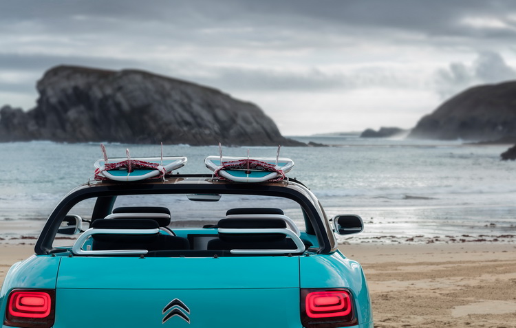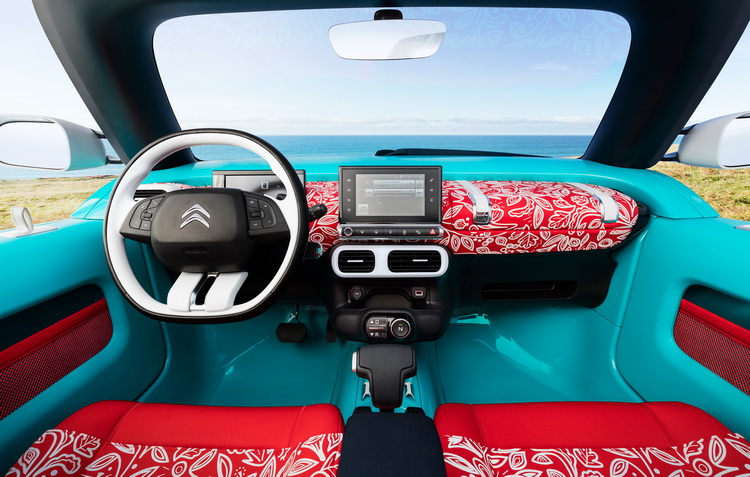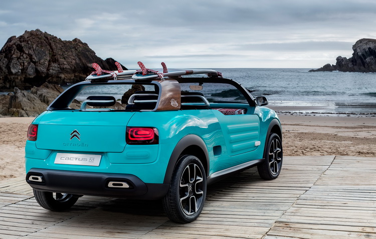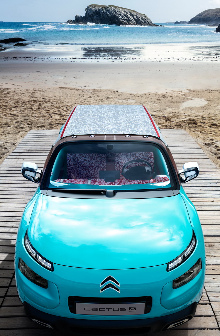 當年的Mehari有不少創新的特色,例如車身鈑件採用了塑料材質所製成,Cactus M也回應了老前輩,使用非常輕量的塑膠作為車門材質,Mehari很像吉普車的60度傾斜式前擋風玻璃設計風格也同樣可在Cactus M身上見到。更有趣的是,Cactus M雖然是沒有車頂的真正「上空」車,但卻導入了可用前擋雨後防滾架來固定沖浪板或纜繩滑水板的設計,形成「延伸的車頂」,既有創意又符合其重視戶外活動的產品調性。