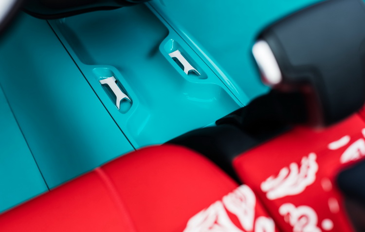 完全開放的車室空間,讓車內乘客與外界周遭環境,因為是雙門設定,所以想要坐進後排,就請你踏在車側的門檻然後直接翻過去。整個車身鈑件材質一路延伸進入車內,不做什麼多餘的材質裝飾鋪陳,而且因為車室底板設有排水孔,所以可以直接沖洗整個車室,真的一整個是戶外運動用品的概念。