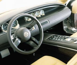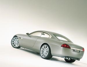 ![]() R-Coupe原則上是一輛用來闡揚造型概念的車,因此機械結構方面的細節並非此車的重點,雖然它實際上是建立在一個並非來自目前現有車款的後驅底盤、並且搭載一具V8動力系統,而非只能遠觀而不能褻玩的全尺碼模型。雙門四座的R-Coupe概念車有個車廠方面稱為『白鑞』(錫合金)顏色的車色,在車身許多部位,包括水箱護罩周圍、側窗框與行李廂蓋等部分,都有典雅的鍍鉻處理。為了強調這隻『大貓』的個性,R-Coupe特殊設計的10輻式合金輪圈上配備有CONTINENTAL特別替該車款開發的285/30R21尺碼、『貓爪』紋路的概念胎款,車尾的尾燈燈殼也是仿效有趣的『貓耳』造型。R-Coupe採用類似S-Type的四圓頭燈與復古水箱護罩設計,但頭燈改為類似筒燈般的設計,這套『可變頭燈系統』採用四個氙氣放電式的筒狀頭燈,其中外側的主燈擁有雙軸設計,在車輛轉向時可修正照射角度改善照明表現,而方向燈則隱藏在引擎蓋縫之內,當不發亮時從外側是完全無法辨認出的。R-Coupe配備有電動車門釋放系統,而尾廂上緣兩側則可以見到特殊亮銀色澤的一對油箱蓋。車室內主要是以烏木飾板、淡金黃色澤的Connolly真皮椅面配合上周圍棕色的反皮內飾,塑造出純正英國式的典雅風味,R-Coupe的中控台處並無法看到平常熟悉的排檔桿,序列式變速箱的檔位實際上是由位在方向盤後方的鍍鉻F1式換檔撥桿來操作。至於這款車其他造型設計上的細節,大家不妨直接從照片中發掘、瞭解。