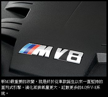 新登場的M3,是M3自1986年(E30)首度登場之後,第四代的傳人。以車體代號E92的3er Coupe雙門轎跑車版本為基礎,在BMW直屬的競技車輛部門M GmbH的加持下,除了一定要大肆修改一番的動力與底盤之外,高性能版本的M3在車身的設計上也做了諸多改變,全車鈑件只有車門與行李箱蓋的部分沿用自3er Coupe,套句成語「脫胎換骨」來形容M3與一般車款之間的差距,並不為過。 新一代M3的諸多特點之中,首度在量產M3版本上出現的V8引擎絕對是鎂光燈聚焦之處,雖然排氣量加大缸數變多,但這具馬力高達420hp的新引擎仍然延續了先前直六引擎的高轉速與高單位容積效益比的特性,而且還更輕、更靈敏;車輛上大部分與性能表現或操控有關的系統,舉凡引擎監理、傳動、懸吊乃至於煞車,都利用了原廠代號MS S60的先進32位元電腦系統加以控制並提供駕駛人依照需求切換模式的可能;為了達到輕量化以強化性能、改善車輛的油耗與提升操控表現,工程師在新M3上大量使用新式材料,其中最受矚目的莫過於全部以碳纖維材料打造的車頂,為了彰顯這點,特別保留了黑色的碳纖原色,使得黑色的車頂成為量產版的M3與概念車M3 Concept之間最大的外觀辨別方式。