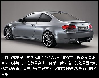 打從2005年代號E90的第五代3系列上市之後,相信應該已經有不少的車迷在那時就開始引頸期盼,新一代的M3會是怎樣的一個模樣?在今年三月的日內瓦車展中,BMW終於滿足了眾人的好奇,展出了概念車版本的M3 Concept,但明眼人一看就知這款概念車的完成度之高,實在看不出有什麼「概念」的感覺。果然,在短短數週之後BMW很快地公佈了2008年式M3的詳細規格,證實當初所謂的概念車,就算稱為「原型車」也並不為過。