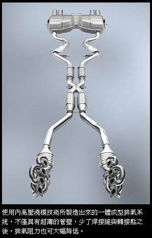 在精密電腦軟體的模擬輔助之下,一體成型的排氣管免除了傳統工法一定無法避免的焊接痕與轉接點這一類多少會影響到實際有效管徑的位置,進而降低排氣阻力,將引擎的性能發揮到極致。