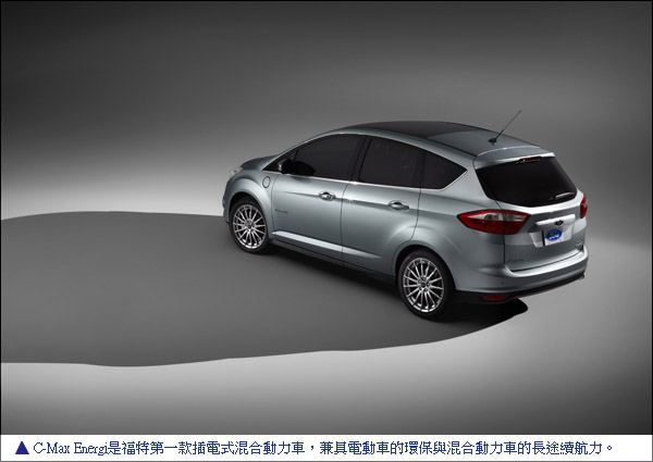 福特已經掌握超過兩百項的混合動力專利,無論是直列四缸引擎、變速箱、機電控制模組等,其中插電式混合動力(Plug-in Hybrid)與混合動力(Hybrid)系統的零組件相通性非常高,有助於降低開發與製造成本。兩者相差主要在於插電式混合動力車裝載較大容量的電池,可使用家中240V電源直接充電,當電力不足時即轉換為引擎與電池的混合動力,可一舉提高行駛里程,以C-Max Energi為例,總行駛里程可達800公里,大舉領先其他品牌的插電式或純電動車,消費者在純電動模式下行駛里程獲得明顯的提昇,同時大幅減少燃油引擎的使用。