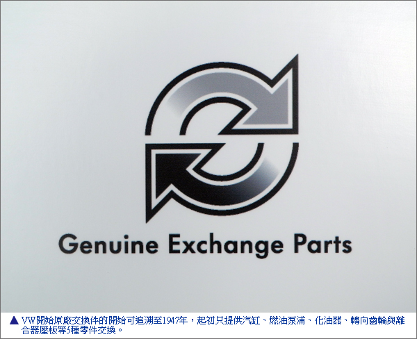 VW原廠交換件主要重點是在引擎與變速箱相關的零件上,而整體的交換範為主要包含引擎零件、離合器/變速箱、車軸/剎車/轉向系統、油汽噴射系統、電系零件及其它如壓縮機、觸媒..等品項零件。