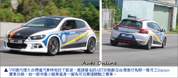 為了Think Blue藍色享樂科技這場活動,VW總代理太古標達汽車特地投下鉅資,邀請著名的ABT改裝廠在台灣進行為期一個月之Scirocco實車改裝,由一般市售小跑車搖身一變為可在賽道競馳之賽車;