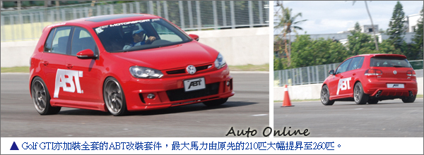 而Golf GTI亦加裝全套的ABT改裝套件,最大馬力由原先的210匹大幅提昇至260匹,保證讓車迷血脈賁張!另外,在車主的熱情支援下,太古標達汽車還召募到國內僅有個位數、高達270匹強大馬力、Golf車系中的性能王者Golf R到場共襄盛舉。