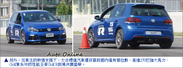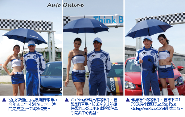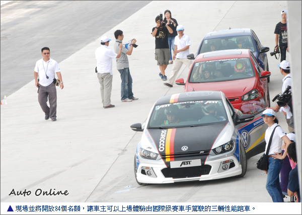 當然VW總代理太古標達汽車準備的不止僅此而已,重金禮聘三位國際級知名賽車手到場:Mr. Mark Williamson(澳洲)、Mr. Alex Yoong(馬來西亞)以及Mr. Jeffrey Lee(台灣)。擁有豐富國際賽事經驗的他們分別駕駛Scirocco ABT、GTI ABT以及Golf R在賽車場上進行一場為時30分鐘的Driving Show;現場並將開放84個名額,讓車主可以上場體驗由國際級賽車手駕駛的三輛性能跑車。