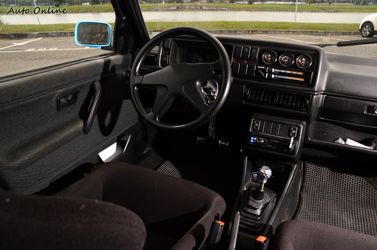 內裝換上兩張桶型賽車椅,金屬高爾夫造型排檔桿,日本VAG改裝廠COX出品的方向盤,中控台上方三環監控儀表,增添車內熱血氛圍。