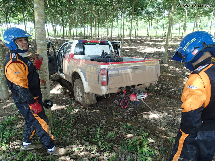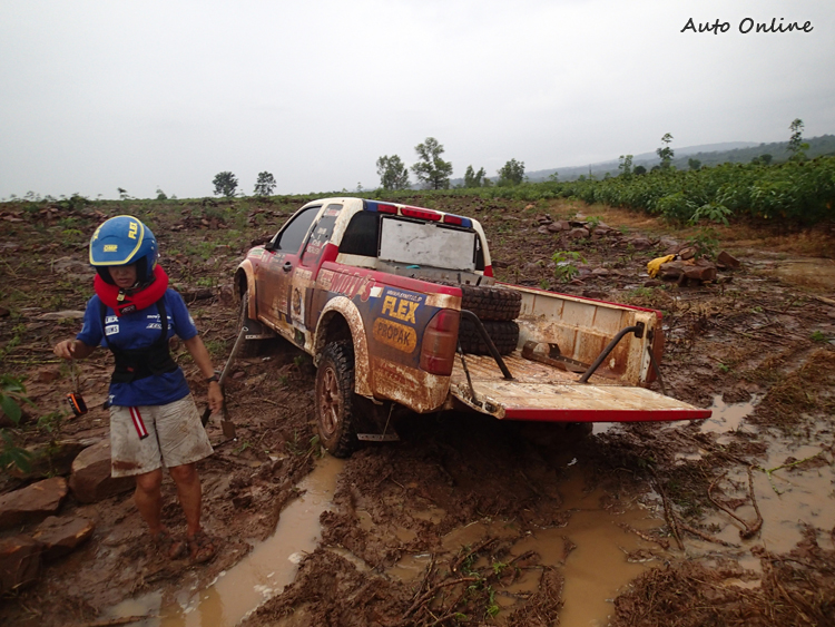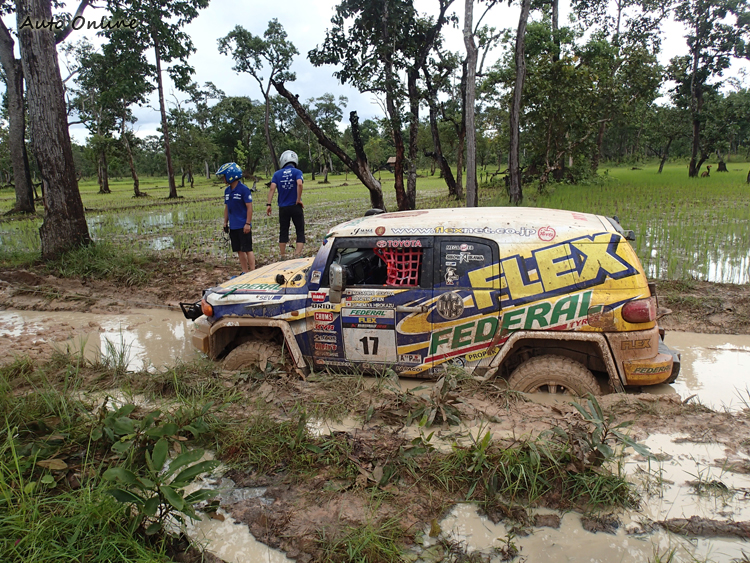 在SS5前半段大洞加上過河的路況,只要放慢車速大洞沒有太大問題。SS5下半段進入泥濘的田間小路,才剛進入就發現17號車卡在水深及腰的洞裡,這時17號車告知我們可以繞旁邊的路先行,ASAI先生不疑有他直接開上旁邊樹叢道路,沒想到一上去就卡在裡面動彈不得。下車想要利用絞盤來脫困,誰知道絞盤的噸位不夠,無法拉動比賽車反而越陷越深,當我們決定放棄等待救援時,環顧四週發現有三輛車都卡在田間道路上。