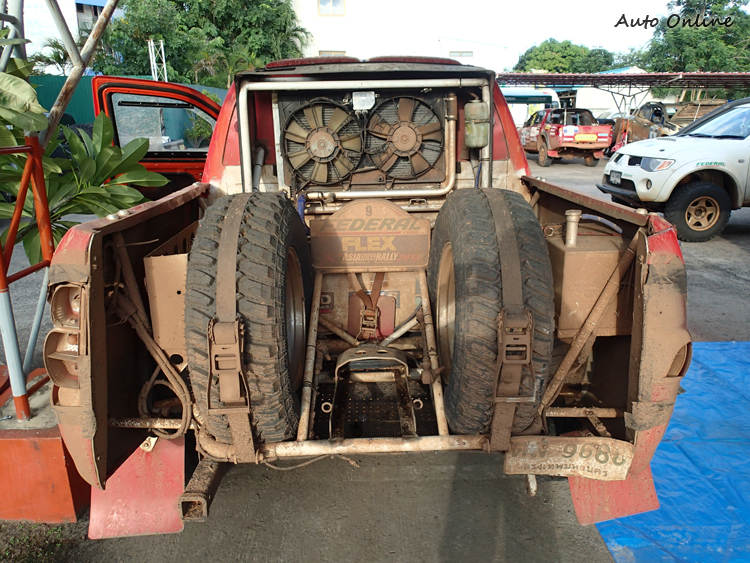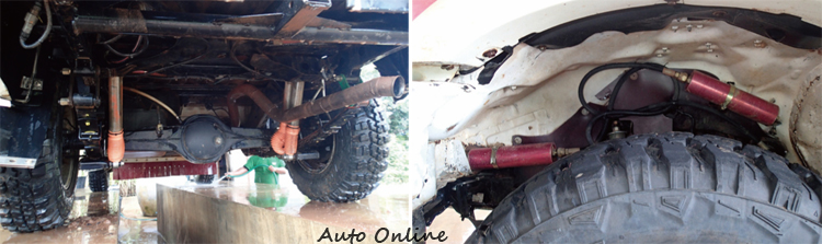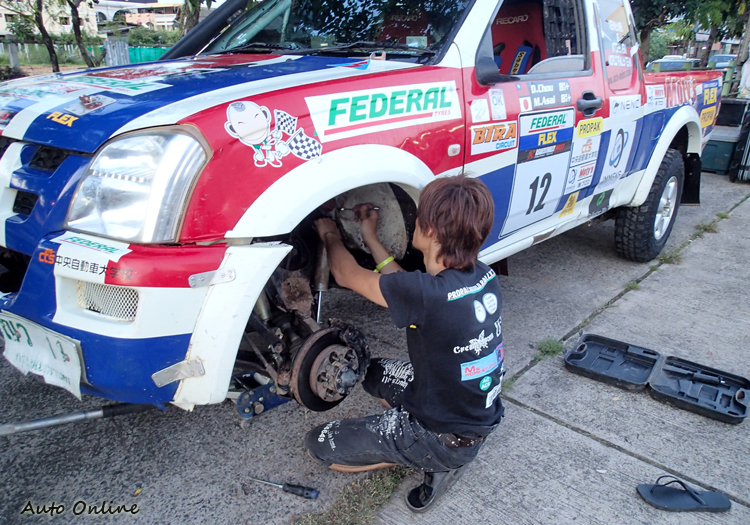 這次我們使用的參賽車輛是2007年的ISUZU D-MAX,此車是在泰國當地租借,車手如果想用自己的車參賽,運費加上關稅,大概與當地租借的費用相差不多。為了要讓D-MAX能通過嚴苛地形的考驗,車輛做了適度的改裝。首先提高車身高度,避免崎嶇路面碰撞底盤,原本只有單支的避震器更換為雙支避震器,前方甚至換上高檔的外接氮氣瓶桶身。引擎動力維持原廠,搭載的3.0L柴油渦輪引擎,最大馬力161hp與最大扭力36.72kgm,這樣的動力表現足以應付AXCR的任何路況。為了避免涉水時引擎吸到水,進氣部分加裝越野涉水進氣管。