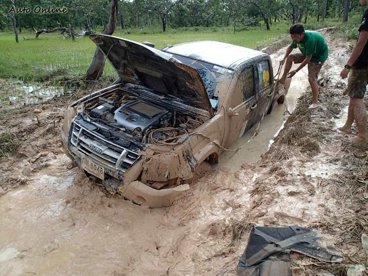 原本想說應該能順利返回飯店結束第一天的賽程,殊不知當地民眾的車輛4WD系統損壞,只有2WD的情況下受困於泥濘道路,而我們為了要協助它脫困,陷入更大的坑洞,就這樣兩輛車陷入困境無法脫困,只好再次徒步走回大路,回到泰國人的家,結束我們第一天的賽程。