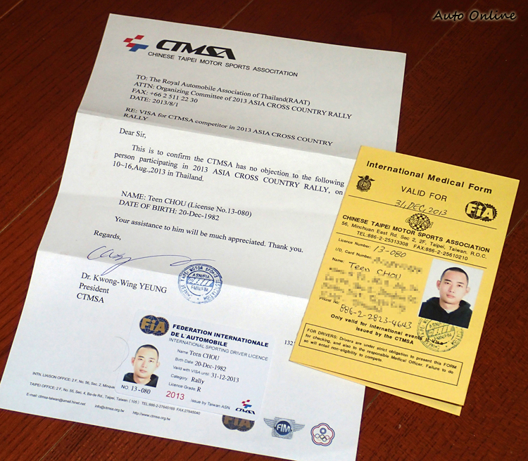 另外,最重要的就是FIA國際賽車執照,沒有國際賽車執照就算你能力再強,一樣無法參與國際賽事,還有MEDICAL FORM(健康報告黃皮書)、VISA/Start Permission海外出賽同意書,缺一不可。證件申請可以前往位於八德路四段的中華賽車協會辦理,先準備好照片、體檢證明以及比賽的邀請函,最重要就是所辦理證件的費用,只要備妥這三項FIA證件,就可以踏上亞洲越野拉力賽的旅程。