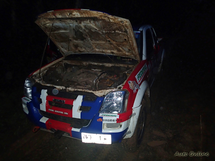 以AXCR來說,車輛受困第一時間最好是自己想辦法脫困,可是我們車輛發電機故障,電瓶完全沒電,就算我們想推發,電瓶沒電也無法啟動引擎,只好待在原地等待救援。連絡上救援單位,他要我們在車上休息,儲備體力等待救援車到來。時間一分一秒過去,看看手錶已經半夜12點,再次打電話確認救援,電話另一頭說可能要明天早上才能來協助我們脫困。這時我與正駕駛ASAI先生討論,透過手機Google Map發現,我們離大路並不遠,走路大概30分鐘,所以我們決定徒步走到大路上尋找救援。就這樣徒步走了30幾分鐘,碰巧地找到一輛同型的D-MAX,與車主拜託之下願意與我們對換電瓶。