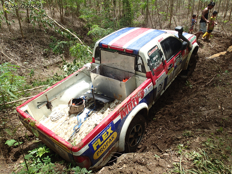 SS3發車沒多久,就因泰國前幾天的豪雨沖斷賽道上的橋樑,溪水的深度又會使車輛滅頂,無計可施,大家只好回到出發點重新起跑。所有比賽車輛重新集結帶往32.86公里處重新發車起跑,這對於我們來說是好事,減少SS賽段里程對狀況不好的比賽車較有利。SS3前半段偏向大洞與大石頭的路況,很爭氣地平安通過,但困難的挑戰才在後面等著我們。PC Start一起跑,就碰到一個很大的落差讓我們折損左後輪胎以及右後輪葉片彈簧,再換完左後輪胎,ASAI先生檢查右後懸吊,決定繼續撐下去到SS3結束。