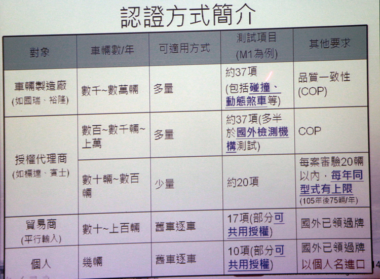 還好交通部允許檢測報告可以「授權共用」,如果送測人能夠取得其他業者或個人同型車的檢驗證明,就能省去很多執行項目,檢測費也能從每輛15萬減少為5萬。而且為了解決排測等待過久,主管機關也授權多家民間實驗室與工研院分攤檢測業務,所以千萬別再以為非得送交ARTC才能掛牌。
