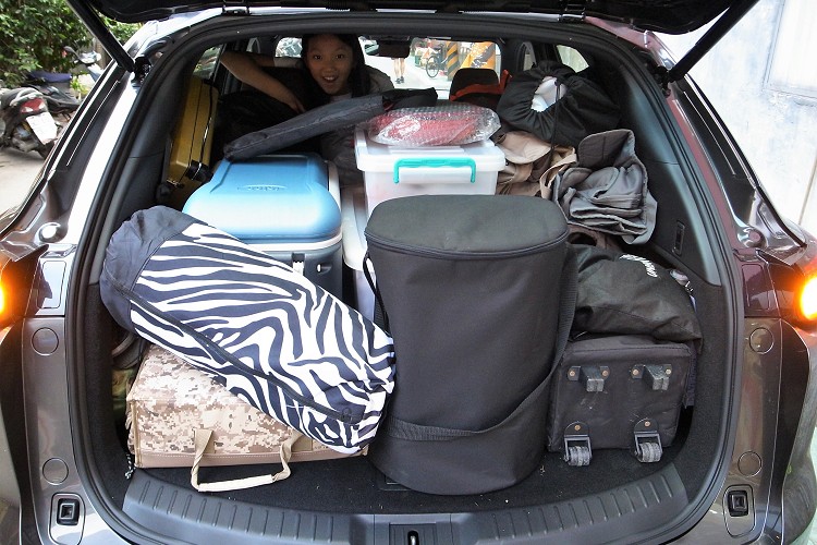 兩天半的露營用品相當可觀,以我的經驗來看,所需帳篷、桌子、廚桌、三張椅子、冰箱、外地墊、內地墊、充氣床、雜貨箱、客廳帳等,用X1來做基準,4/2/4分離座椅只留下4給女兒坐,這些東西可剛好塞滿,緊繃到無法再放入其它物品。為傾倒後座椅背下,X1擁有420公升至物容積,這數據變成我看後行李廂的標準。