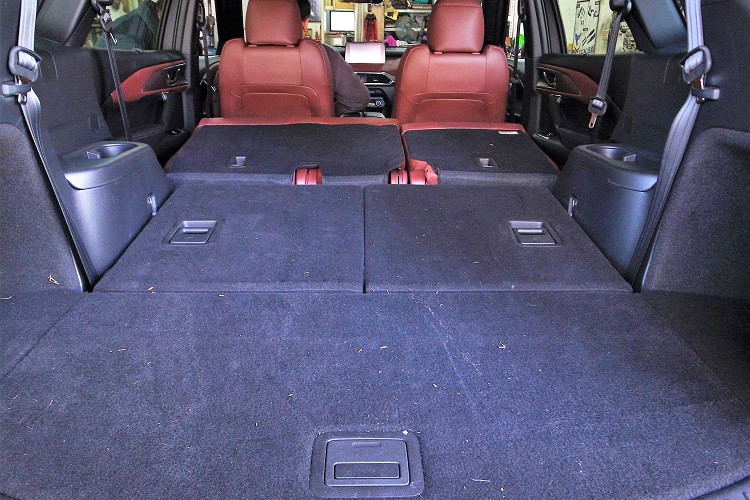 那我們來看看Mazda CX-9的後行李廂置物機能,它是屬於七人座休旅車,但非正統的七人座,第三排只適合乘坐孩童,成人會感到些許壓迫以及不適感。載貨為主的設定加上三位成員(包含駕駛),收折第三排座椅可以得到810公升,這幾乎是X1的兩倍空間。實際看上去不覺得如此寬敞,最大原因是後廂底板內的大尺寸備胎造成底板過高,視覺受到影響。另外,想要有810公升的置物容積,第二排座椅必須稍稍向前移動,才能達到數據宣稱的行李廂容量。