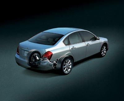 Teana後懸吊與E-Class設計類似,採用減震筒與圈簧分離設計,大幅縮小避震塔體積,能增加車室及行李廂空間。縱像拖曳連桿與橫向SLA長短連桿皆與副樑銜接,碎震抑制效能更佳。一般的後獨立懸吊(如TOYOTA