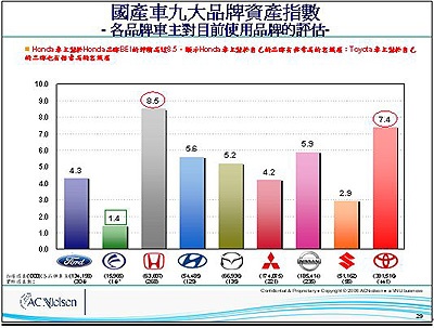 根據AC尼爾森今年6月23日至7月27日針對台灣1,802位、45款車型的國產車主以及1,095位進口汽車車主所做網路線上汽車品牌資產調查顯示,九大國產汽車品牌中,Toyota品牌資產領先群倫,指數高達4.6,其次為Honda的3.3,至於其他七大品牌的品牌資產指數則皆未進入3或以上之列。至於奪得進口汽車品牌資產第一名的BMW,品牌資產指數高達4.6,Lexus以3.4次之,而Mercedes-Benz則以3.3居季軍。
