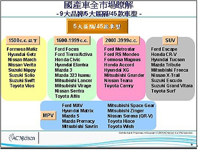 AC尼爾森線上汽車品牌資產調查採用ACNielsen︱Winning Brands模組於今年6月23日至7月27日與Yahoo!奇摩(tw.yahoo.com)合作進行,訪問台灣1,095位進口汽車車主以及1,802位、三年內曾購買國產汽車的車主,包含車款多達45款。九大國產汽車品牌分別為Ford、Formosa、Honda、Hyundai、Mazda、Mitsubishi、Nissan、Suzuki與Toyota(依英文字母排序)。