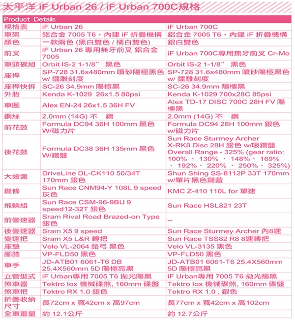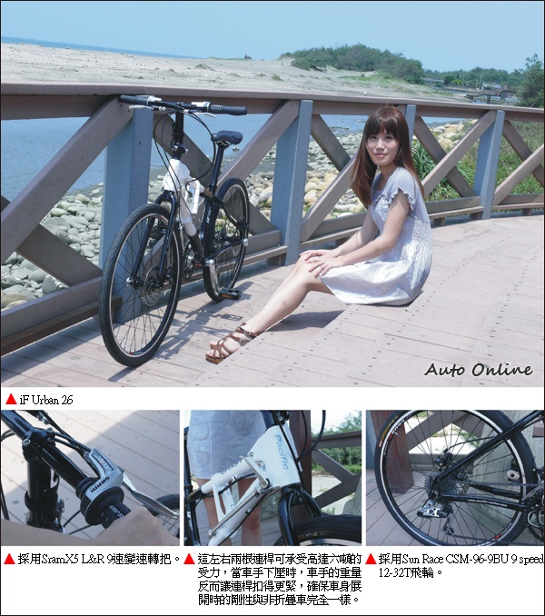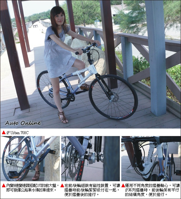 iF Urban 26和iF Urban 700C,在相同的車架下搭配不同的輪組以及不同系統的變速機構,雖然兩者看起來非常相似,不過實際騎乘的感受卻相當不同。iF Urban 26騎起來就像一般的登山車一樣,紮實、穩定,絲毫沒有橫向摺疊車不安定的騎乘感覺。而iF Urban 700C除了紮實、穩定外,更具有速度感,雖然僅有內變8速,不過在內變8速的高齒比下,可發揮出公路車一般的速度。