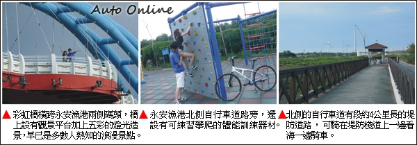 不過這次的單車路線,還是會依照多數人晚起的習慣來介紹。將車停妥在永安漁港後,永安漁港本就是個漁港兼觀光魚市,除了可以選購現補漁獲、大啖生猛海鮮外,在魚市旁的彩虹橋橫跨永安漁港兩側碼頭,橋上設有觀景平台加上五彩的燈光造景,早已是多數人熟知的浪漫景點。