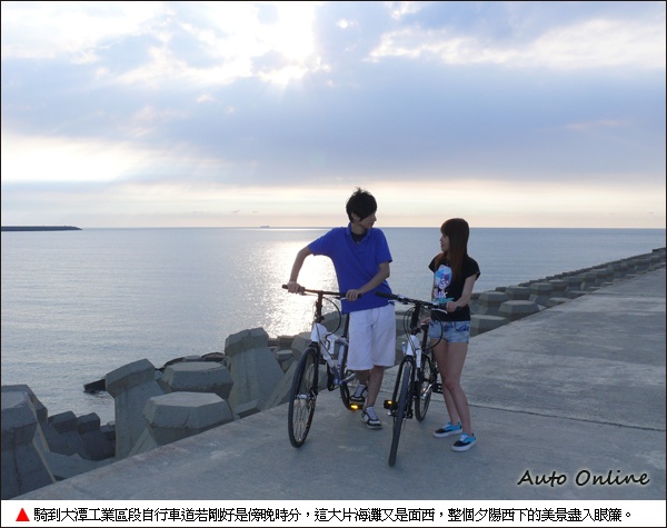 我們從日正當中開始騎行,騎到這裡時約莫是傍晚時分,這大片海灘又是面西,整個夕陽西下的美景盡入眼簾。這段大潭工業區段的自行車道會經過大潭發電廠、觀音風力發電區,又會有許多特別的景觀,喜歡拍照的同好可別漏失這景色豐富的外拍景點。