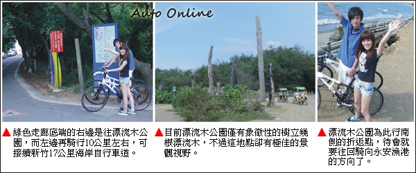 綠色走廊走到底是一T字路,左邊是經過福興宮通往台61濱海公路、右邊則是通往漂流木公園休憩區。漂流木公園雖然僅立了幾根象徵性的漂流木做代表,不過這裡的景觀還真的是不錯。若要繼續騎行南下,可走福興宮旁的車道,約10公里後即可接續新竹17公里海岸自行車道,不過我們是以漂流木公園作為折返點,因此在此處開始折返往永安漁港的方向。