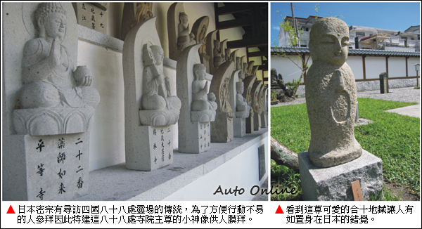 此外這裡還有仿照日本密宗傳統的巡八十八彿石像,透過參拜這八十八尊石彿之後再在繞行百度石據說同樣有消災治病療效。雖說科學時代宗教治病的說法不應推廣,但在當時醫療不發達的年代當中,這類的宗教場所給人們更多的心靈上的撫慰,即便你不是彿教徒到這裡一樣可以體察這日系風格的建築之美。