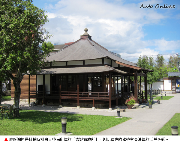 要推薦給大家的景點就是位於花蓮吉安鄉的慶修院。初到這個地方你會訝異為何花蓮地區會有這樣一個充滿日本江戶風情的地方。聽著導覽人員解說才知道這裡是在日據時期由日本到花蓮的移民所建立的宗教場所。原名是「吉野布教所」,所祭祀的彿教派別是日本的真言宗高野派。