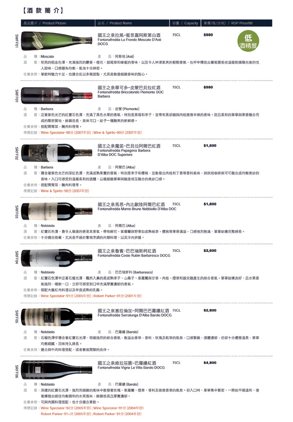 ![]() 國王之泉酒廠除了釀製皮蒙區的傳統頂級酒款,亦生產有「瓊漿玉液」之稱的拉風‧蜜思嘉阿斯第白酒(Le Fronde Moscato d’Asti DOCG)。阿斯第(Asti)產區生產相當優異的蜜思嘉(Moscato)葡萄品種,由於其獨特的荔枝與玫瑰花香氣息,成為全世界最著名的微汽泡酒產區,與法國香檳齊名。由於廣受全球市場喜愛,於義大利的生產量僅次於奇揚第(Chianti)。