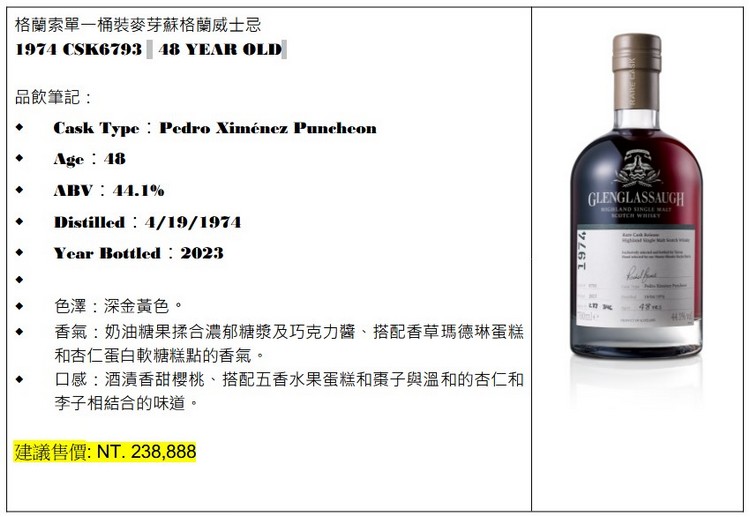 ![]() 格蘭索 48年單一桶裝麥芽蘇格蘭威士忌,原桶強度,深金黃色的酒液透出瓶身,如同將歷經48年鬱鬱蔥蔥的蘇格蘭海岸魅力,一閃而耀地盡收眼底。其酒液自1974年始,全程在珍稀的西班牙高級 Pedro Ximénez Puncheon雪莉桶中熟成,高達48年的歲月沈浸,奶油糖果揉合著濃郁糖漿及巧克力醬,伴隨香草和杏仁軟糖的香氣融合;一入口的酒漬香甜櫻桃感受,與水果蛋糕、棗子及杏仁結合帶來的口感尾韻,彷彿活躍於夕陽漫漫的蘇格蘭海灣邊,從酒液中自然感受格蘭索的價值精神-喚醒你的靈魂。