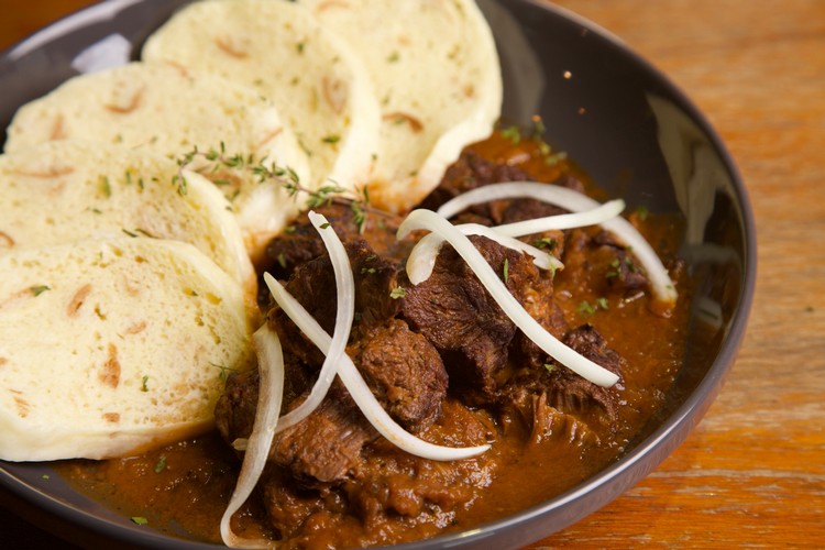 • 經典燉牛肉佐麵團子:濃郁洋蔥底與蕃茄紅椒的燉牛肉,特別要搭配用蒸煮方式製作而成的knedliky手作麵團,是捷克宴會和家庭聚餐中的經典主菜。