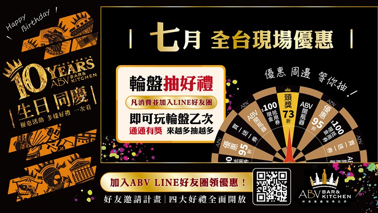 邁入創立十週年的 ABV Bar & Kitchen,今夏以「十週年狂歡月」為名號召全台14間門市聯合慶生,自即日起至7月31日止,推出一連串現場活動與LINE好友圈限定福利,邀請新舊顧客一起來ABV吃好喝滿、玩好抽滿,體驗十年餐桌旅程的誠意回饋。 為了讓十週年成為精釀迷與異國料理愛好者的夏季記憶,ABV全台門市於七月推出多項限定活動。從生日優惠到現場抽獎,每一位來店消費的顧客,都有機會感受到ABV的十年感謝心意。